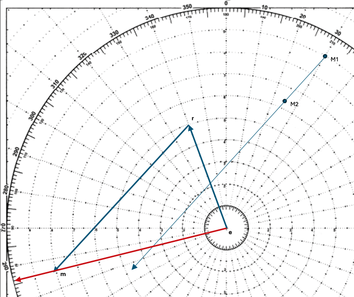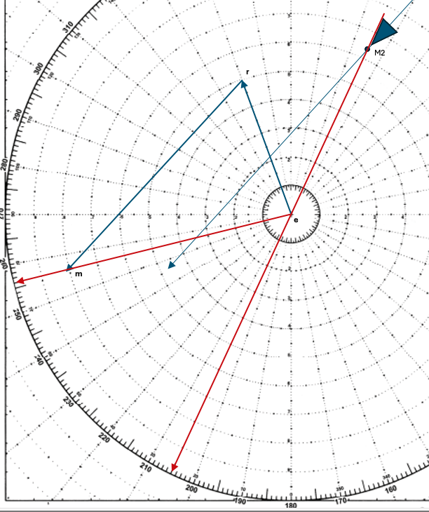 The aspect can also be determined by plotting a line from “M2” (the last plotted position of the other vessel) through e, and continuing to the compass ring as shown below. The aspect is the angle of created. Drawing a representation of a vessel at M2 on the RML vector, and looking at the relationship from the “e” position provides the red or green portion. In image below, from “e”, you see the port side of the other vessel, so the aspect color is red.