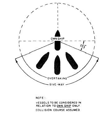 A vessel is deemed to be overtaking when coming up on another vessel from a direction more than 22.5 degrees abaft (behind) her beam. This is the angle prescribed by the stern light. At night, the overtaking vessel will see only the white stern light of the vessel being overtaken.